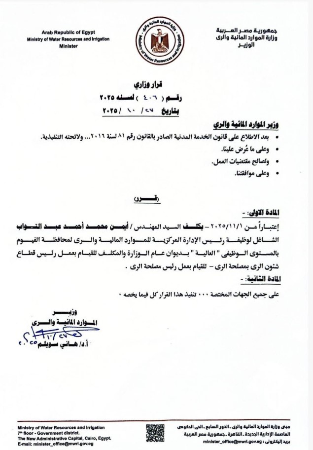 وجاء في قرار وزير الري الذي حمل رقم ٤٠٦ لسنة ٢٠٢٥، والمؤرخ اليوم ٢٧ أكتوبر ٢٠٢٥، أن يتسلم المهندس أيمن عبد التواب «أيمن نضر»، مهام عمله رئيسًا لمصلحة الري، اعتبارًا من ١ نوفمبر المقبل.