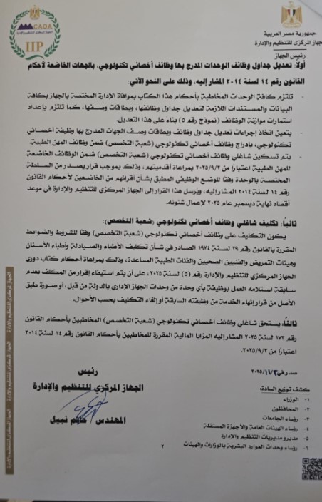 كما ينص الكتاب على أن التكليف على وظائف أخصائي تكنولوجي "شعبة التخصص"، سيتم وفقًا لأحكام القانون رقم 137 لسنة 1974، بشأن تكليف الأطباء وهيئات التمريض والفنيين الصحيين والفئات الطبية المساعدة، وبما يضمن توحيد منظومة التكليف داخل المهن الصحية.