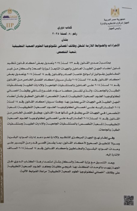 رحبت النقابة العام للعلوم الصحية، بالكتاب الدوري رقم 8 لسنة 2025، الصادر عن الجهاز المركزي للتنظيم والإدارة، بشأن الإجراءات والضوابط اللازمة لشغل وظائف أخصائي تكنولوجيا العلوم الصحية التطبيقية "شعبة التخصص"، والذي يُعد خطوة مفصلية نحو الاعتراف الكامل بدور خريجي كليات ومعاهد العلوم الصحية التطبيقية، ودمجهم رسميًا ضمن منظومة المهن الطبية في مصر.