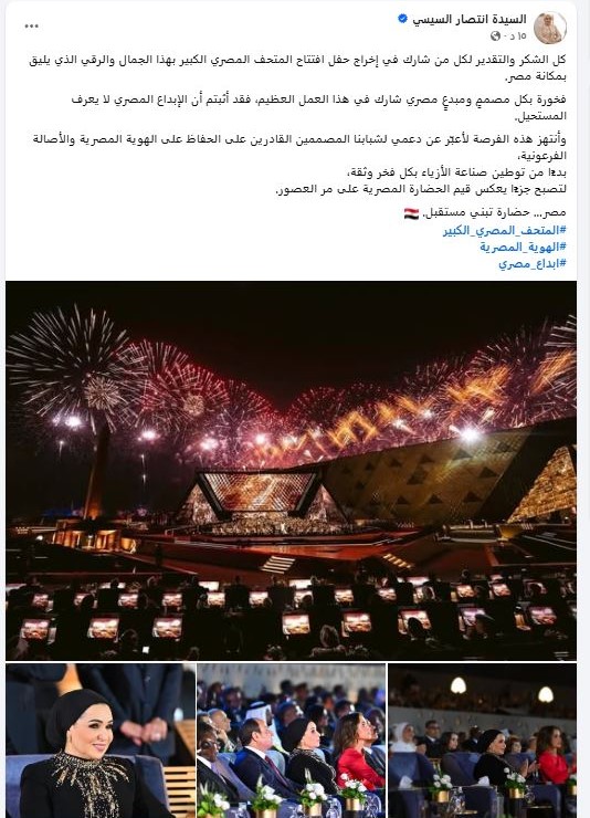 وجهت السيدة انتصار السيسي، كل الشكر والتقدير لكل من شارك في إخراج حفل افتتاح المتحف المصري الكبير بهذا الجمال والرقي الذي يليق بمكانة مصر.