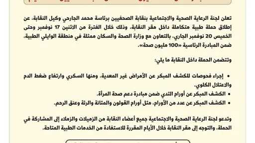 وتدعو لجنة الرعاية الصحية والاجتماعية جميع أعضاء النقابة من الزميلات والزملاء إلى المشاركة في الحملة، والتوجه إلى مقر النقابة خلال الأيام المقررة للاستفادة من الخدمات الطبية المتاحة.