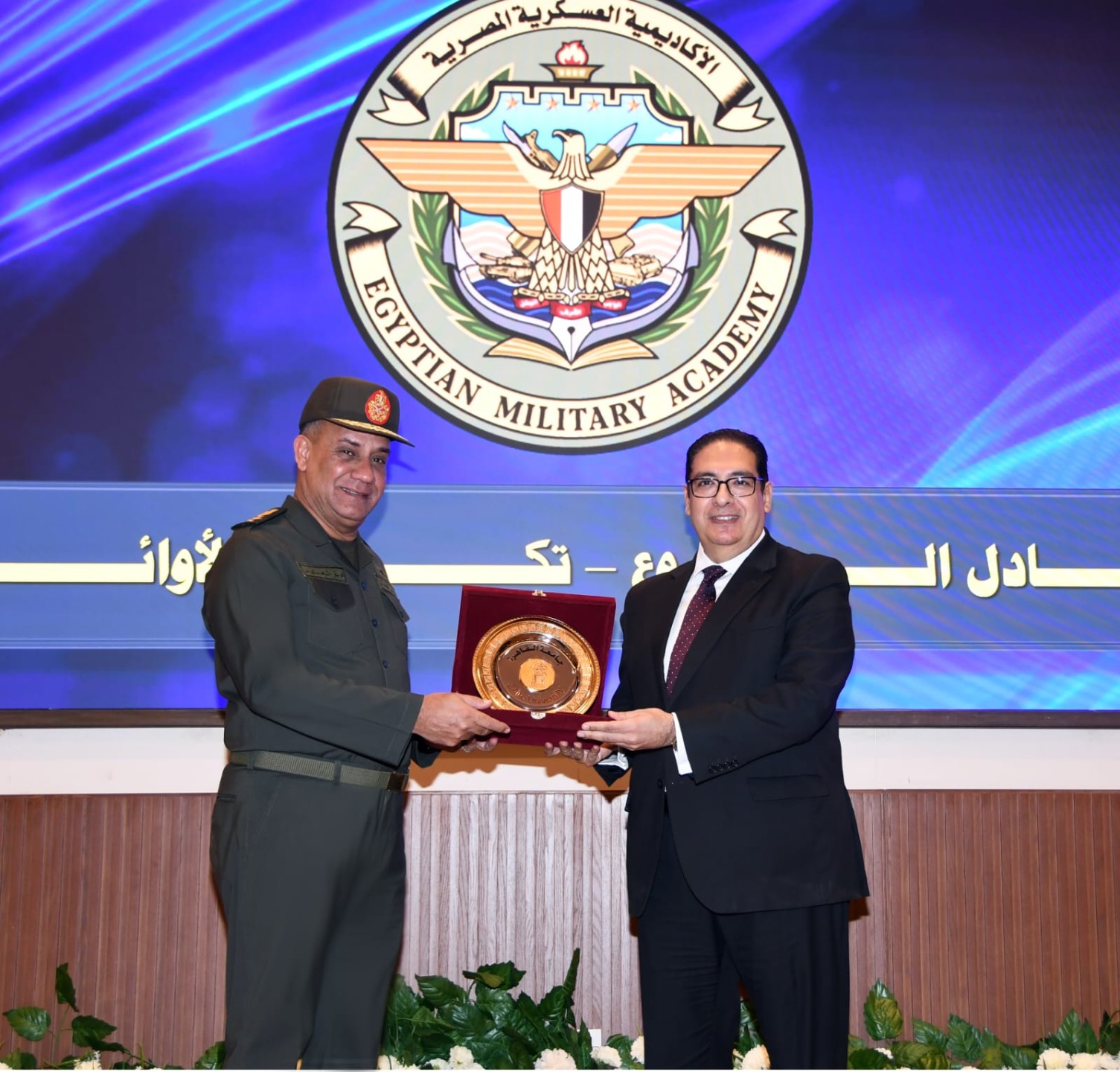 كما ألقى الفريق أشرف سالم زاهر مدير الأكاديمية العسكرية المصرية كلمة أشار خلالها إلى أن الأكاديمية تُسخِر كافة جهودها لإعداد أجيال جديدة قادرة على آداء مهامهم التى سيكلفون بها بكل تفانٍ وإخلاص بمختلف التخصصات وأختتمت مراسم الإحتفال بتبادل الدروع وتكريم المتميزين فى الدورة.