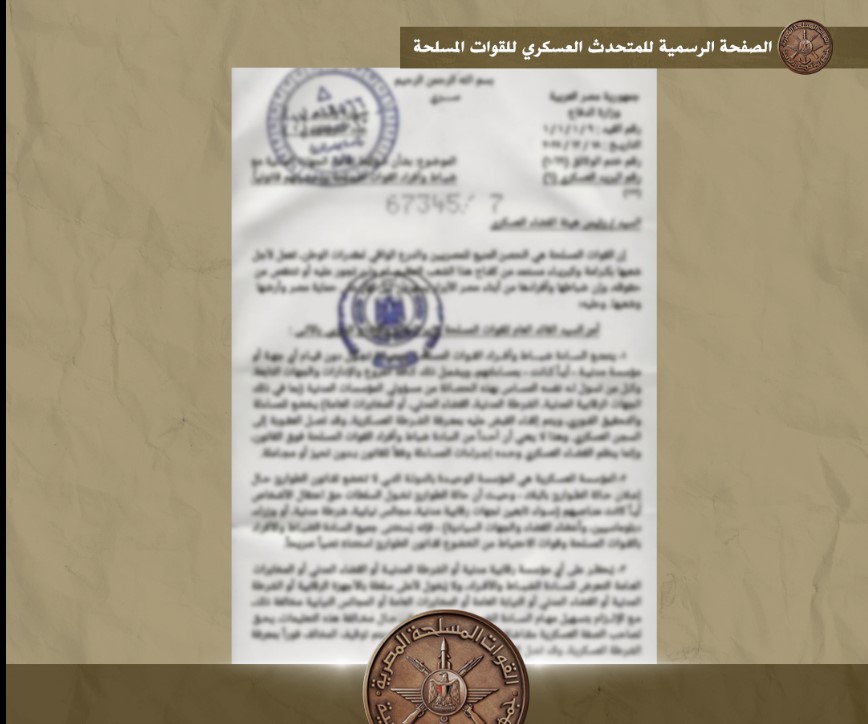 وتؤكد القوات المسلحة أن جيشكم هو جيش الشعب ، نابع من صلبه ومن تراب هذا الوطن الخالد ، ملتزم بأحكام الدستور وسيادة القانون ، وسيظل درعًا وسيفًا لحماية مصر وشعبها.