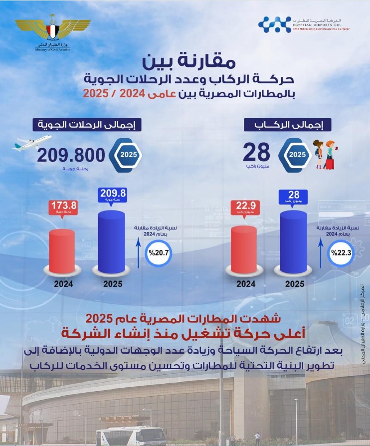 خلال 2025.. طفرة غير مسبوقة حققتها المطارات المصرية بنسبة نمو تجاوزت 22% في حركة الركاب و20% للرحلات الجوية