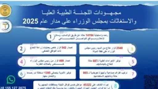 ونوّه الدكتور/ حسام المصري أيضًا إلى أنه تم إصدار عدد 468 قرارًا خاصًا بالحالات الطارئة من رئيس الوزراء، فضلًا عن توفير الأدوية بإجمالي 1395 استغاثة تم رصدها والتعامل معها على مدار عام 2025.