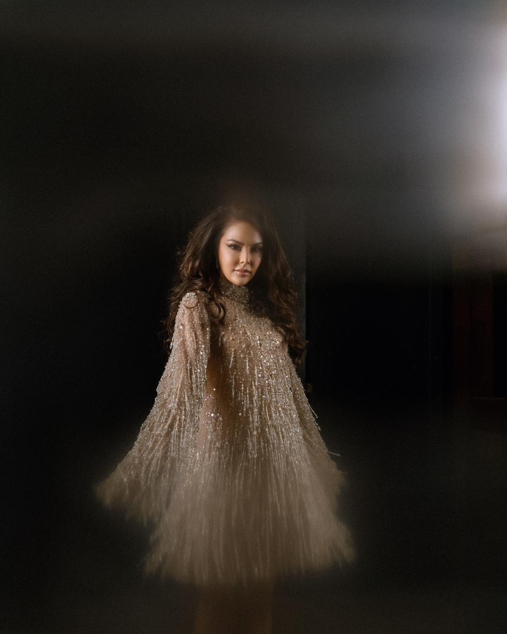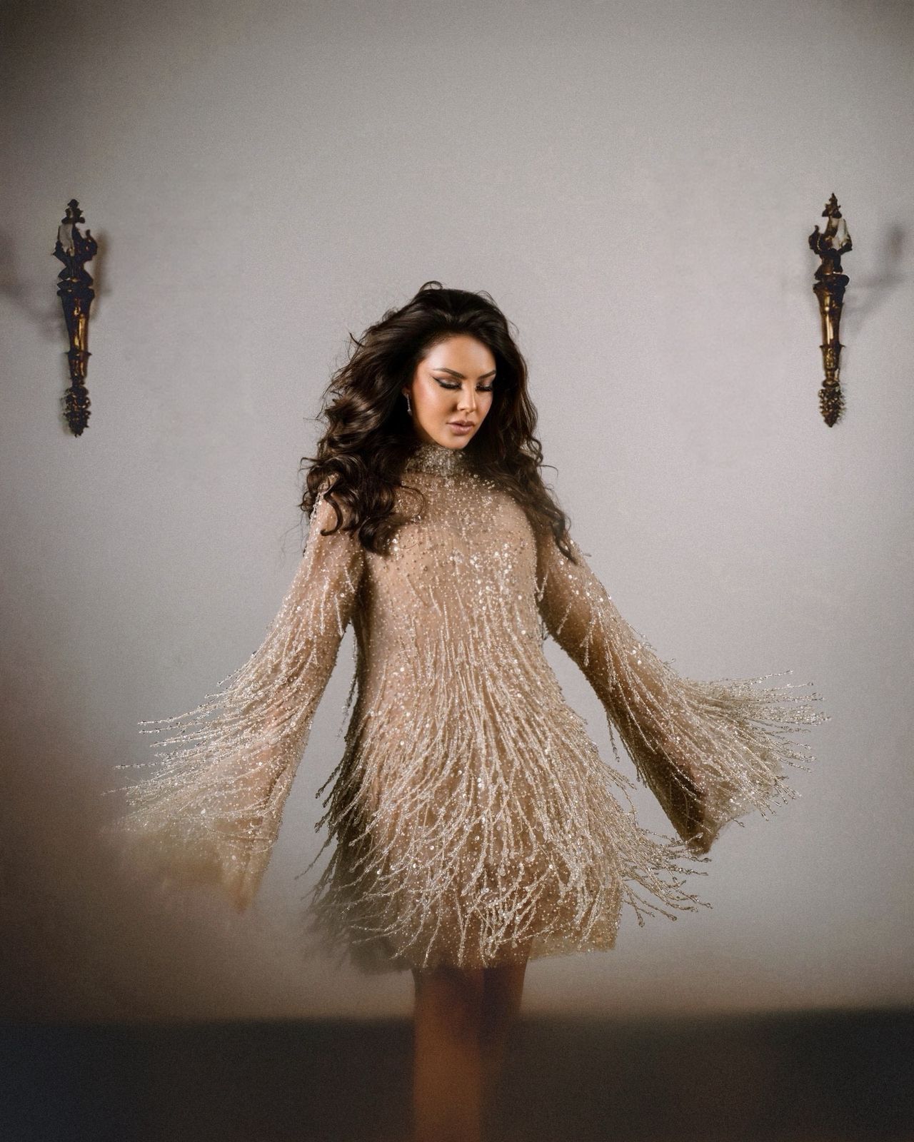 واعتمدت النجمة الصاعدة نينا مغربي فستانا ذا قصة طويلة بأكمام شفافة واسعة، تميزت بتطريز كثيف ومتدرج أضفى حركة وحيوية على التصميم، بينما جاء الياقة المرتفعة لتمنح الإطلالة لمسة من الرقي الكلاسيكي، في توازن ذكي مع جرأة الخامة وتفاصيلها اللامعة.