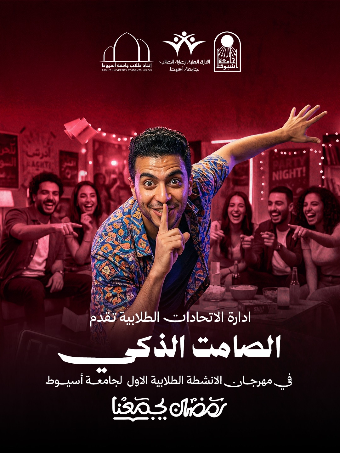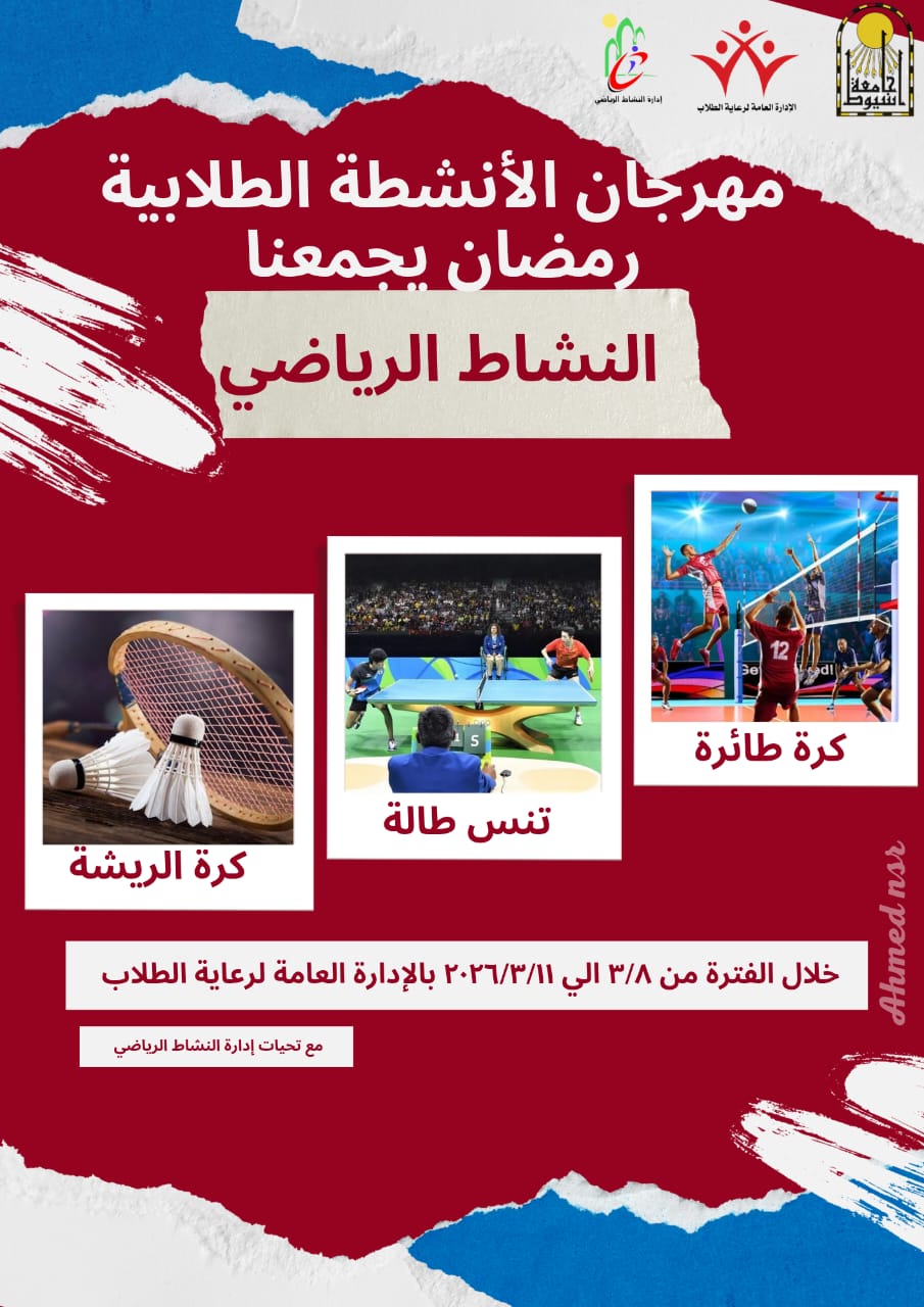 تحت رعاية الدكتور أحمد المنشاوي رئيس جامعة أسيوط، تنظم الجامعة مهرجان الأنشطة الطلابية "رمضان يجمعنا"، وذلك تحت إشراف الدكتور أحمد عبدالمولى نائب رئيس الجامعة لشئون التعليم والطلاب، والدكتورة مديحة درويش المشرف العام على الأنشطة الطلابية، والدكتور هيثم إبراهيم مدير عام إدارة رعاية الطلاب، في إطار حرص الجامعة على تعزيز روح المودة والتكافل بين أبنائها خلال شهر رمضان المبارك.