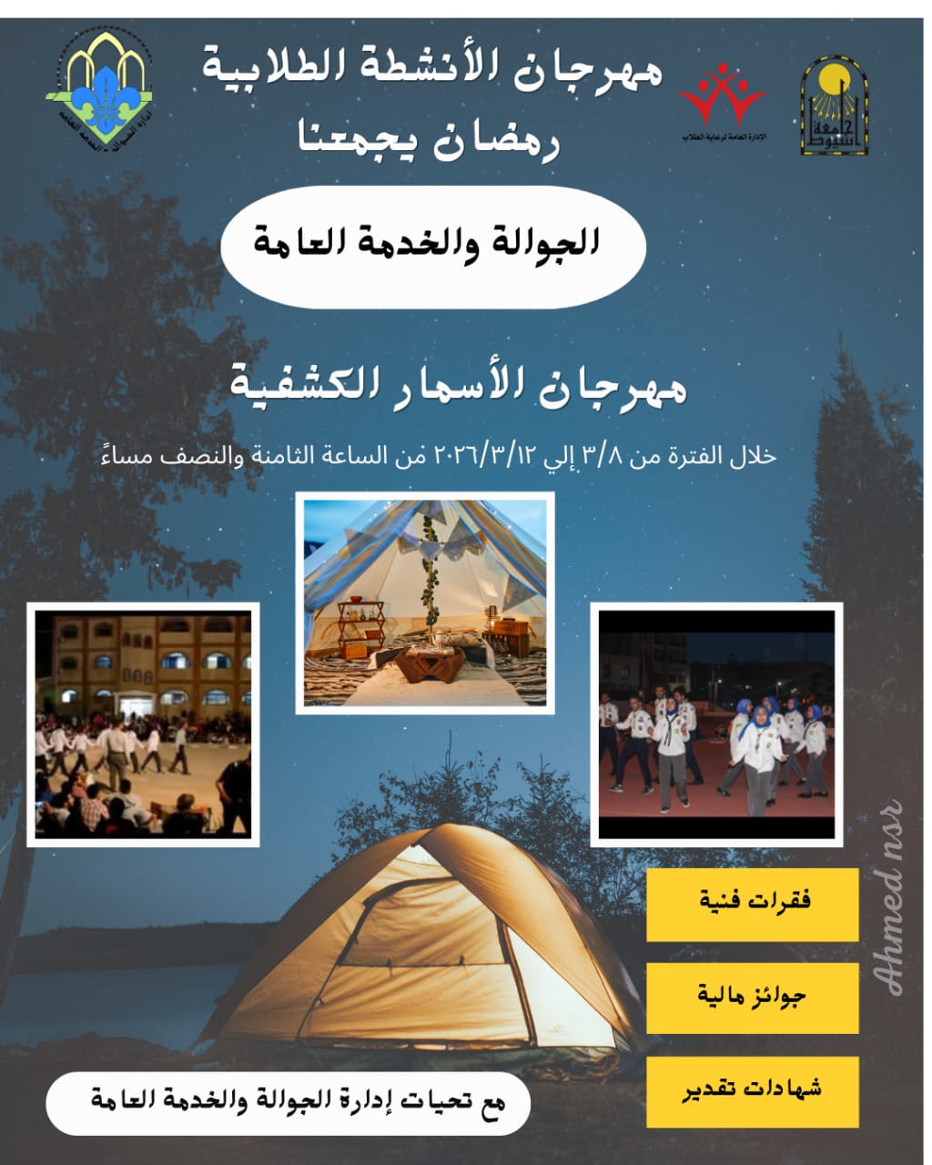 وفي إطار الأنشطة الكشفية والخدمية، يُقام مهرجان السمر الكشفي خلال الفترة من 8 إلى 12 مارس 2026، في أجواء رمضانية مميزة، ويتضمن فقرات فنية وثقافية، إلى جانب جوائز مالية وشهادات تقدير للمشاركين.