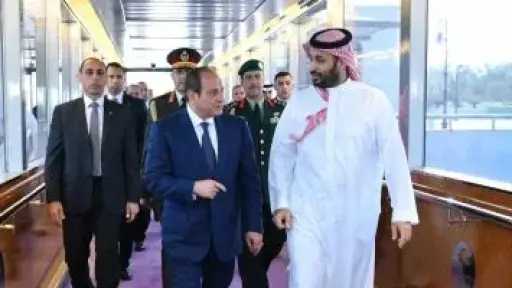 وأشار المتحدث الرسمي إلى أن الرئيس توجه بعد ذلك إلى المملكة العربية السعودية، حيث كان في استقباله لدى الوصول إلى مطار الملك عبد العزيز الدولي بمدينة جدة أخوه لأمير محمد بن سلمان، ولي عهد المملكة رئيس مجلس الوزراء، إلى جانب السفير إيهاب أبو سريع، سفير مصر لدى الرياض، حيث تم عقد جلسة مباحثات بين الرئيس السيسى والأمير محمد بن سلمان بمشاركة وفدي البلدين، أكد خلالها الرئيس دعم مصر التام للمملكة في مواجهة التحديات الإقليمية الراهنة، وعلى أن أمن المملكة هو جزء لا يتجزأ من أمن مصر وعلى أن الأمن القومي لدول الخليج العربي يُعد امتدادًا للأمن القومي المصري، مشيدًا بحكمة القيادة السعودية لخادم الحرمين الشريفين وولي العهد، ومؤكدًا مساندة مصر لما تتخذه المملكة من إجراءات لحماية أمنها واستقرارها ومصالح شعبها الشقيق.