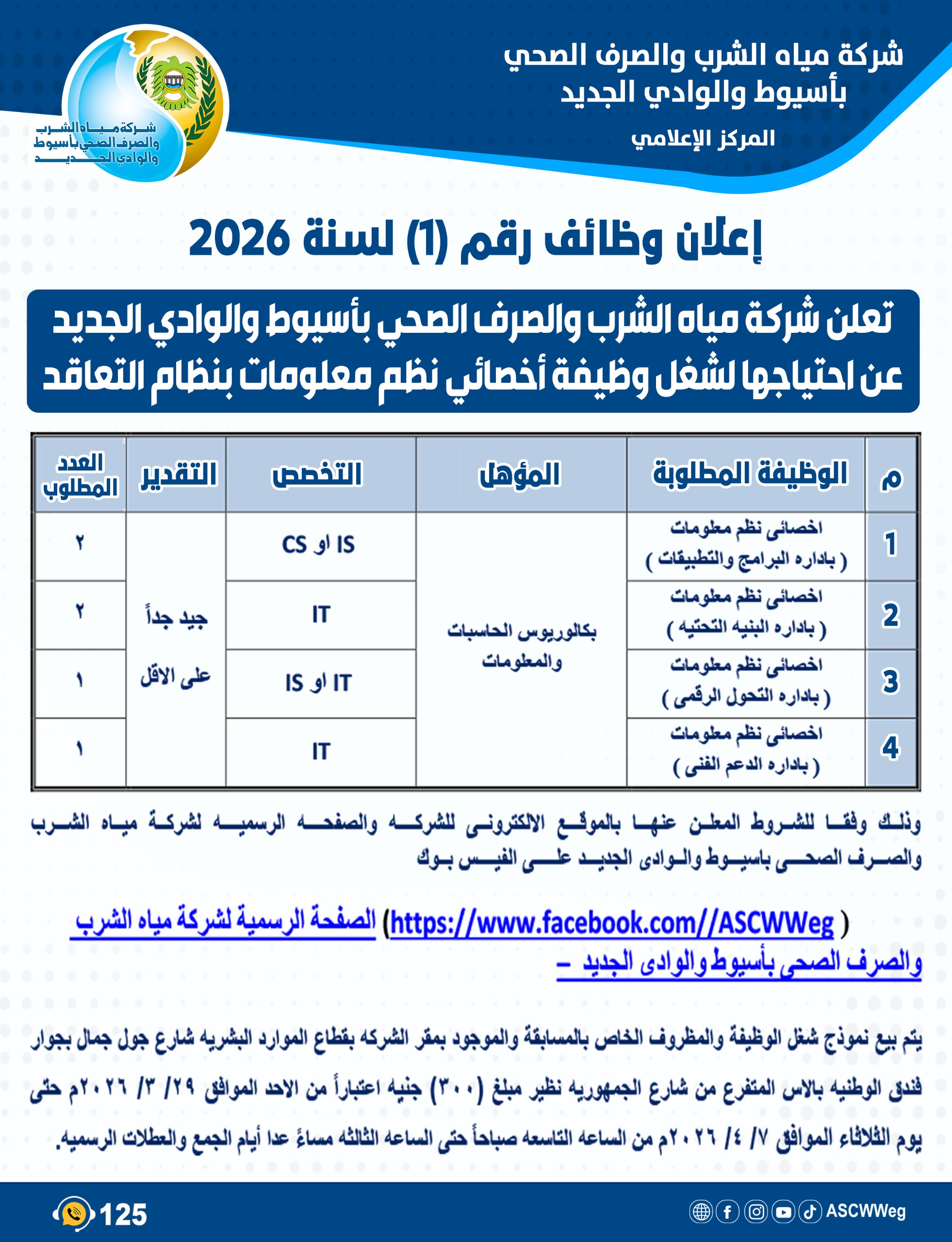 مياه أسيوط تعلن عن مسابقة رقم ( 1 ) لسنة 2026م لشغل وظيفه أخصائي نظم