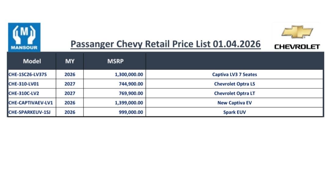 وشملت القائمة الجديدة بتاريخ الأول من أبريل الجارى أسعار السيارات شيفروليه أوبترا الجديدة المجمعة محليا بفئتيها، شيفروليه كابتيفا، شيفروليه سبارك الكهربائية الجديدة، وشيفروليه كابتيفا الكهربائية.