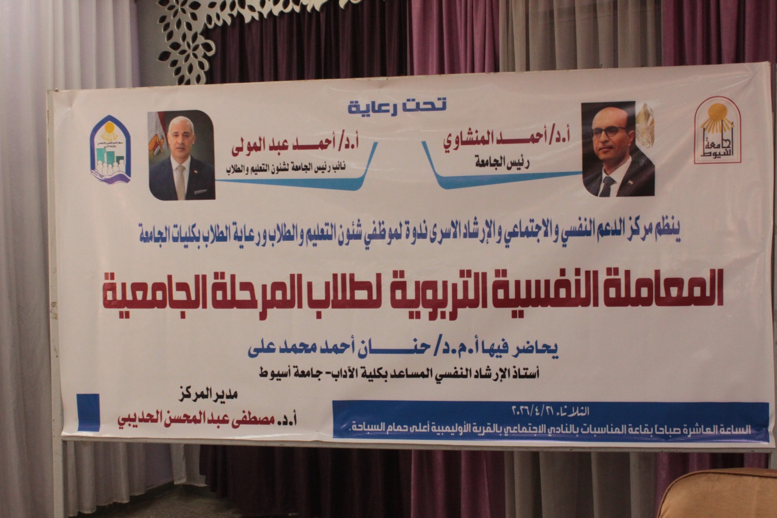 تحت رعاية الدكتور أحمد المنشاوي، رئيس جامعة أسيوط، وبإشراف الدكتور أحمد عبد المولى، نائب رئيس الجامعة لشئون التعليم والطلاب، نظم مركز الدعم النفسي والاجتماعي والإرشاد الأسري بجامعة أسيوط ندوة توعوية استهدفت العاملين بقطاعي شئون التعليم والطلاب ورعاية الطلاب بمختلف كليات الجامعة، وذلك لمناقشة أسس المعاملة النفسية التربوية لطلاب المرحلة الجامعية، في إطار توجه الجامعة نحو دعم الصحة النفسية والاجتماعية للطلاب، ورفع كفاءة الكوادر الإدارية المتعاملة معهم بشكل مباشر.