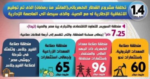 وبشأن أبرز أوجه التعاون بين مصر والصين، فقد كشفت إنفوجرافات المركز الإعلامى لمجلس الوزراء, أن تكلفة مشروع القطار الكهربائى (العاشر من رمضان – العاصمة الإدارية) تبلغ 1.4 مليار دولار، وقد تم توقيع الاتفاقية الإطارية له، فضلاً عن منطقة السويس للتعاون الاقتصادى والتجارى بين مصر والصين (تيدا)، والتى تبلغ إجمالى مساحتها 7.25 كم2، وتنقسم المنطقة إلى أربعة قطاعات صناعية وهي: منطقة صناعة المعدات البترولية، باستثمارات نحو 60 مليون دولار، ومنطقة صناعة معدات الكهرباء ذات الجهد العالى والمنخفض، باستثمارات مخططة بقيمة 96 مليون دولار، ومنطقة صناعة المعدات الزراعية بإجمالى استثمارات 65 مليون دولار، وأخيراً منطقة صناعة الفيبر جلاس, وتتمثل فى شركة "جوشى مصر" لصناعة الفيبر جلاس.