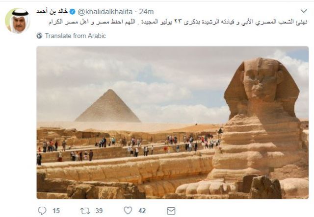 وكتب وزير الخارجية البحرينى عبر حسابه على موقع التغريدات القصيرة تويتر، قائلاً: "نهنئ الشعب المصرى الأبى وقيادته الرشيدة بذكرى 23 يوليو المجيدة، اللهم أحفظ مصر وأهل مصر الكرام".